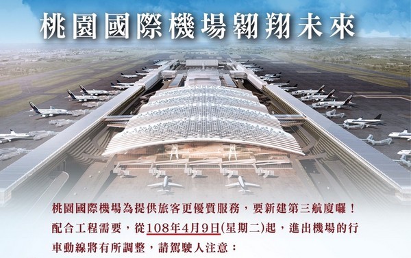 為配合動線轉換施工需要,4月8日夜間21:30至4月9日清晨05:30止,由國道進入機場園區動線縮減為1個車道;4月9日夜間21:30至4月10日清晨05:30止,出機場前往國道動線也會縮減為1個車道;另園區舊迴轉道則於4月8日夜間21:30至4月10日清晨02:00封閉,由台4線貨運園區進入機場方向車輛若要迴轉至第二航廈出境層或P4停車場,請沿國道2號前進至大園交流道下匝道後再迴轉,新迴轉道將於4月10日清晨02:00開放啟用。(動線轉換如遇豪大雨等天候因素可能順延,若需調整,詳細時間將再另行公告)
