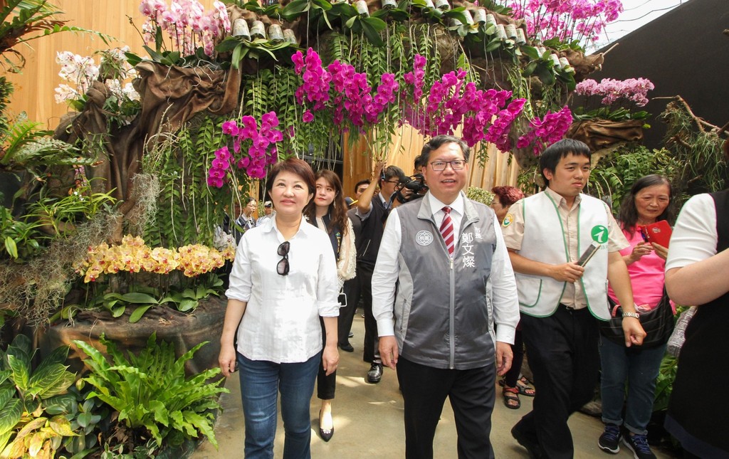 桃園市長鄭文燦8日下午帶領市府團隊二度參觀台中花博,台中市長盧秀燕、觀旅局長林筱淇等人熱情歡迎,並且全程陪同參觀馬場園區花舞館、阿拉伯皇家寶馬綠雕,感受花博兼具現代與古典之美。花博吉祥物「來虎」與桃園市吉祥物「ㄚ桃」及「園哥」,也到場共襄盛舉,氣氛熱鬧。