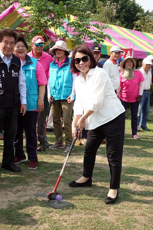嘉義市108年度市長盃地面高爾夫球錦標賽,日前於嘉義市八掌溪親水公園球場熱鬧登場,來自台北、雲林、台南、高雄等縣市共27隊約320人參賽。市長黃敏惠特別前往致意向所有選手問候,並現場揮桿體驗地面高爾夫球揮桿的樂趣,同時也致贈獎品給90歲以上的高齡長輩們。