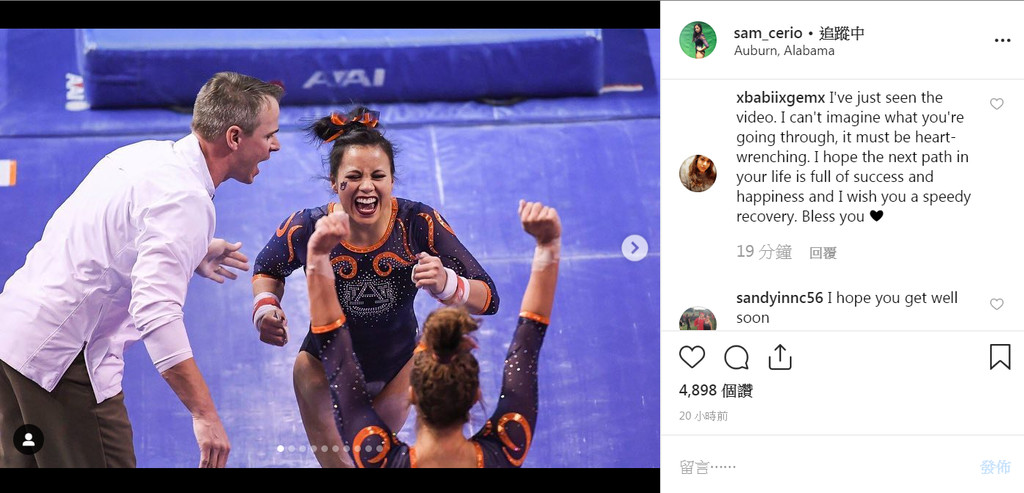 美國奧本大學女子體操隊四年級選手薩曼莎(Samantha Cerio )專注地盯著眼前紫色體操墊,希望能以最完美表現,幫助學校從NCAA區域冠軍賽中晉級。當隊友為她歡呼時,薩曼莎臉上閃過一抹微笑,展開練習已久的一連串舞步和動作。