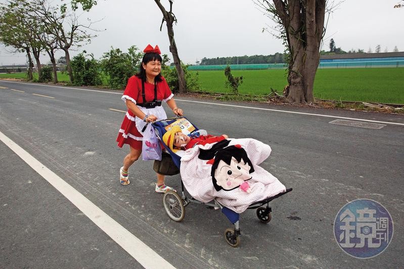 ▲穿著女僕裝的陳嘉齡,把兒子打扮成動漫人物魯夫,那是她最喜歡的角色,「有打不死的精神」。路過的跑友帶著孩子,大聲為他們加油。
