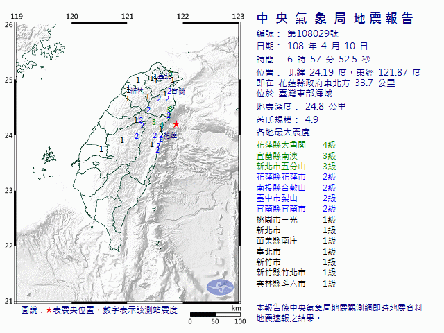 花蓮8小時連4震!根據中央氣象局的地震報告,10日上午6時57分發生芮氏規模4.9的有感地震,震央位於東部海域,地震深度24.8公里,花蓮最大震度4級、宜蘭縣、新北市震度3級,台北雖只有1級震度,但可感受到明顯搖晃。而稍早7時10分花蓮外海又發生規模3.5地震,花蓮、宜蘭震度2級。