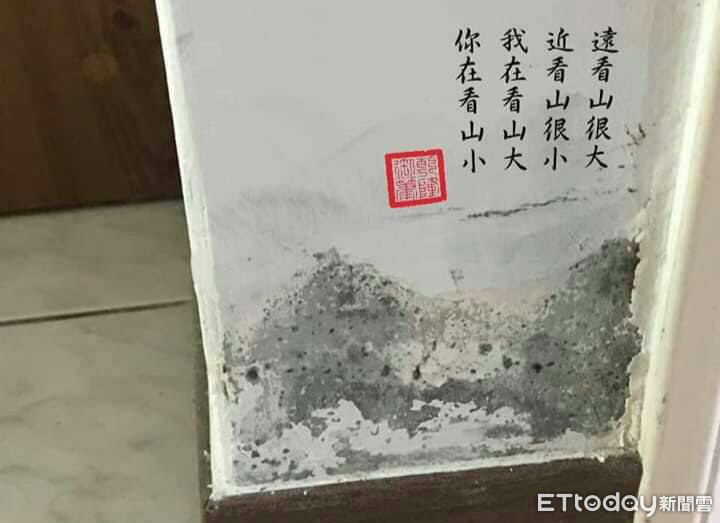 許多人家中飽受壁癌之苦,一名網友就化腐朽為神奇,在牆角斑駁剝落處的斜上方,巧妙地題字蓋章,瞬間成了一幅充滿詩意的山水畫,驚艷上萬人,不禁讚嘆「被抓漏工程耽誤的國畫大師」、「唐伯虎轉世了」。