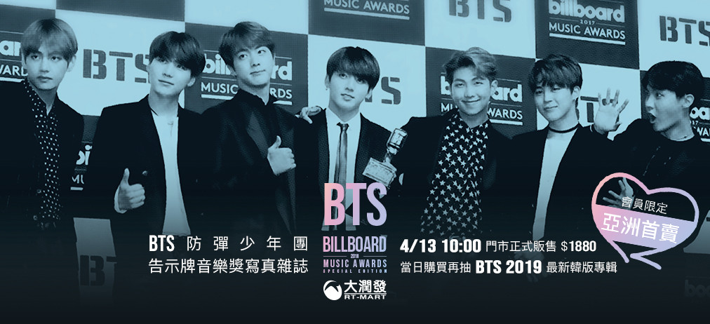去年BTS獲獎後,韓國Hao Korea官方年底在美國發行的5萬本BTS告示牌紀念寫真雜誌早已售罄,現在台灣大潤發量販店獨家爭取到一萬本亞洲首賣的機會,搶先在4月13日開始販售,除了讓台灣粉絲收藏極具紀念價值的寫真雜誌外,更是要讓BTS感受到台灣A.R.M.Y們的熱情威力。