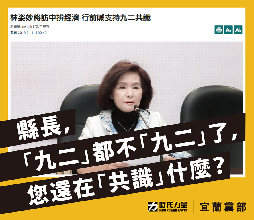 時代力量宜蘭黨部表示,根據媒體報導,宜蘭縣長林姿妙表態挺九二共識,並表示:「我們就是認為九二共識是拚經濟、交朋友,讓大家過更好的生活,就是這樣!」更說道:「我們的目標就是希望用來拚經濟,純粹拚經濟,顧生活,大家和平相處。」
