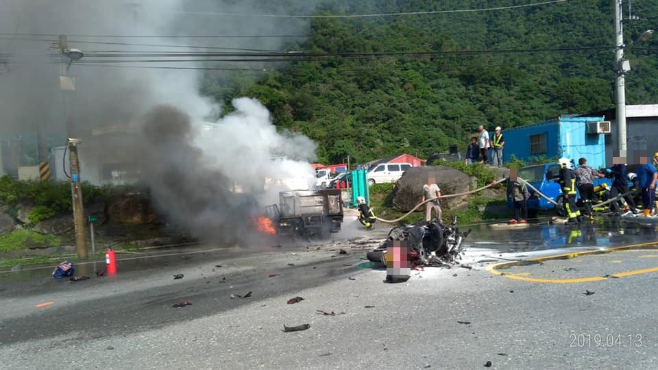 警方表示,吳男13日上午8時許駕駛貨車,行經花蓮縣秀林鄉台9線162.5K北上車道左轉時,不幸與林男駕駛的重機發生擦撞,重機因為衝撞貨車右側油箱,造成貨車油箱破裂起火燃燒,林男也當場噴飛摔入貨車的後斗受困,當消防人員趕到現場撲滅火勢後,受困男子已經全身燒焦明顯死亡。