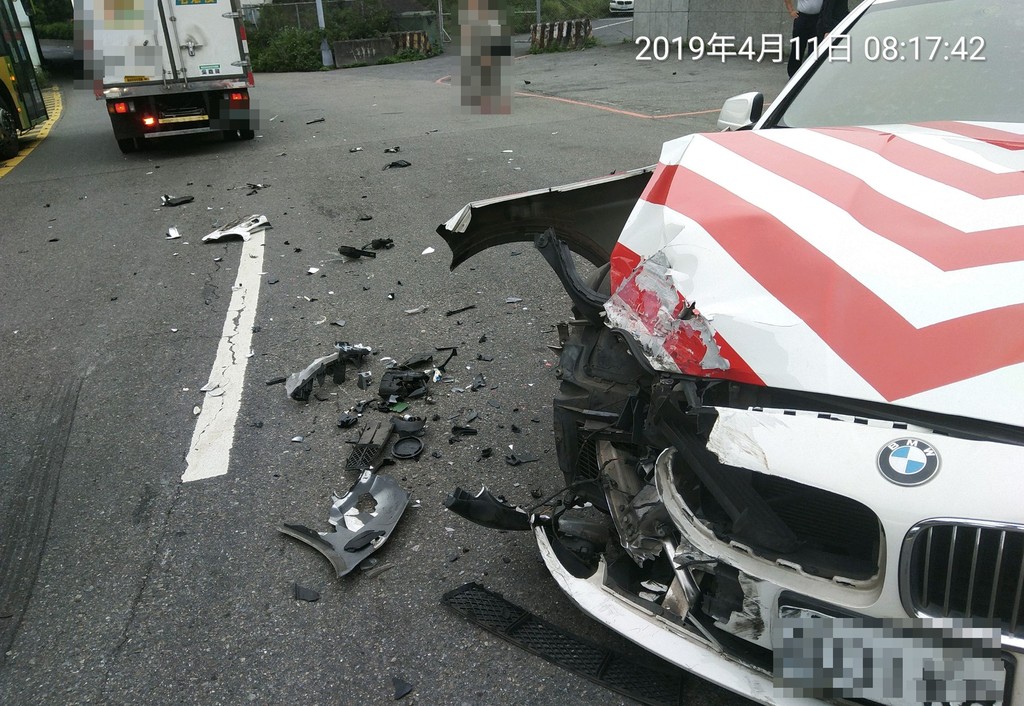 竟然在家門口被擊落!國道公路警察局濱江小隊有一輛BMW紅斑馬11日剛從駐地開出,結果立刻就跟外頭一輛宅急便貨車發生擦撞,紅斑馬的車頭被整個削過破損、碎片也散落一地,所幸意外沒有造成人員傷亡。車禍影片立刻在臉書瘋傳,網友紛紛留言說:「波麗士大人,你累了嗎?」