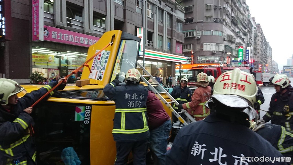 新北市新莊區中原路與昌平街口,16日下午5時許,發生計程車與一部違規停車的黑色BMW自小客車擦撞後,翻車四輪朝天,後方機車騎士閃避不及,追撞計程車,體重百餘公斤司機一度卡在車內,經警消運用破壞器材將他救出,送往署立台北醫院救治,幸好僅受輕傷。