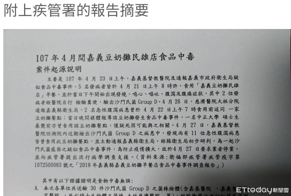 ▲▼ 嘉義知名豆漿店去年因食物感染沙門桿菌,導致一民眾暴斃多人上吐下瀉,受害家屬出示疾管暑摘要報告。(圖/翻攝Dcard)