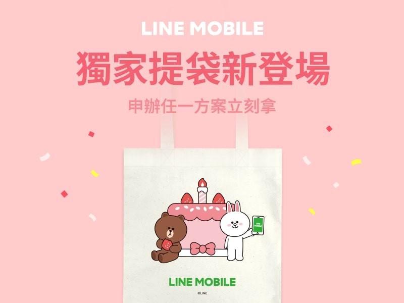 LINE MOBILE宣布,4月17日是LINE FRIENDS經典角色兔兔的生日,因此推出LINE MOBILE x LINE FRIENDS獨家聯名款帆布袋,其中蛋糕慶生款更是以最受歡迎的萌Q情侶檔熊大和兔兔作為主角,並從即日起至4月30日,只要申辦LINE MOBILE全系列資費就送熊大、兔兔獨家聯名款帆布袋。