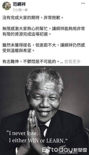范綱祥則在臉書坦言「有志難伸,不鬱悶是不可能的」,並貼上人權鬥士曼德拉照片與名言,自勉「我從沒輸過。我只有:贏,或者是學到教訓」。