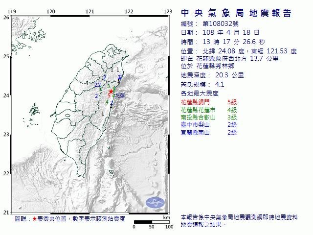 18日13:01左右花蓮發生規模6.1地震後,在13:17又在發生4.1地震,震央一樣在花蓮縣秀林鄉,深度僅20.3km,各地最大震度5級。