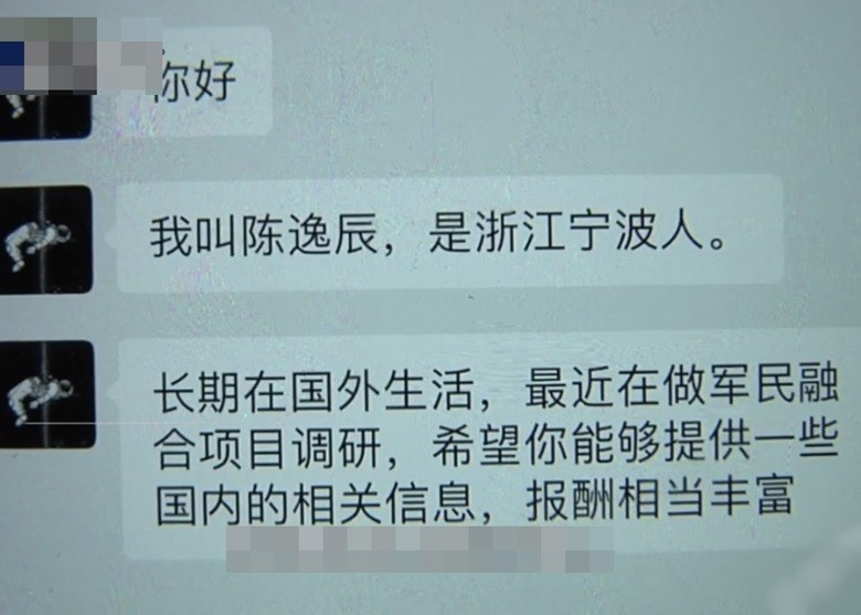 國安部門透露,鄭州市國家安全局的偵察員,今年初逮捕一名在鄭州某大學就讀的李姓一年級學生。去年10月,李姓學生被自稱長住國外的浙江寧波人陳逸辰通過QQ邀請加為好友。陳聲稱最近在做「軍民融合」計畫的調查研究,希望李生能夠提供一些國內的相關資訊,並答應事成之後支付豐厚報酬。