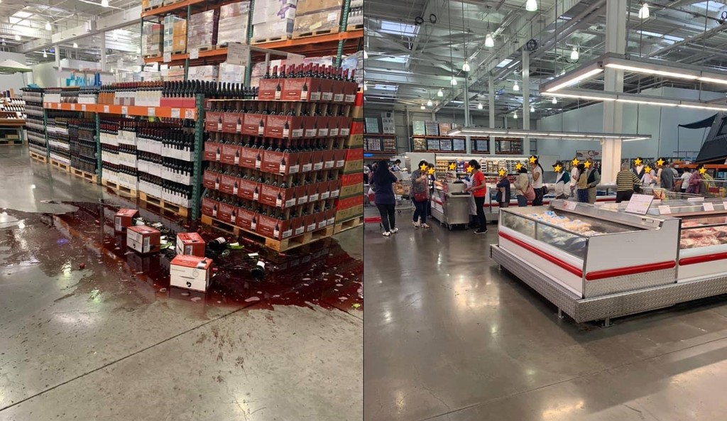 ▲強震瞬間,好市多賣場內酒瓶「跳樓」碎裂,工作人員忙著巡視上層貨架。(圖/翻攝COSTCO 好市多 消費經驗分享區)