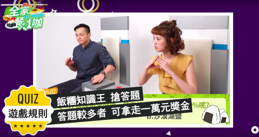 接著兩人就開始「飯糰知識王」的答題大考驗。不過,原本信心滿滿的阿諾,可是慘遭滑鐵盧,一路都被Fred壓著打,不斷被電椅電到狂尖叫,像是「外食族追求健康,使用什麼鹽可以減納30%?」、「哪種米可以做出好吃的飯糰?」、「初摘海苔大都在什麼季節採收?」、「好吃的飯糰是什麼口感?」等題,都是由Fred搶得先機,並回答出正確解答。