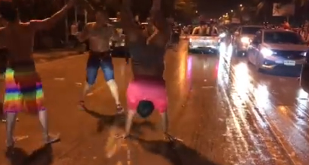 泰國日前展開一年一度盛大的潑水節,不少民眾與遊客紛紛上街狂歡!有網友在臉書分享民眾在大街上熱舞狂歡的影片,一名身形相當壯碩、體重高達140公斤的男子也一起在路上大肆熱舞,動作超級靈活,任何高難度的舞蹈動作都難不倒他,讓網友們都嘖嘖稱讚!
