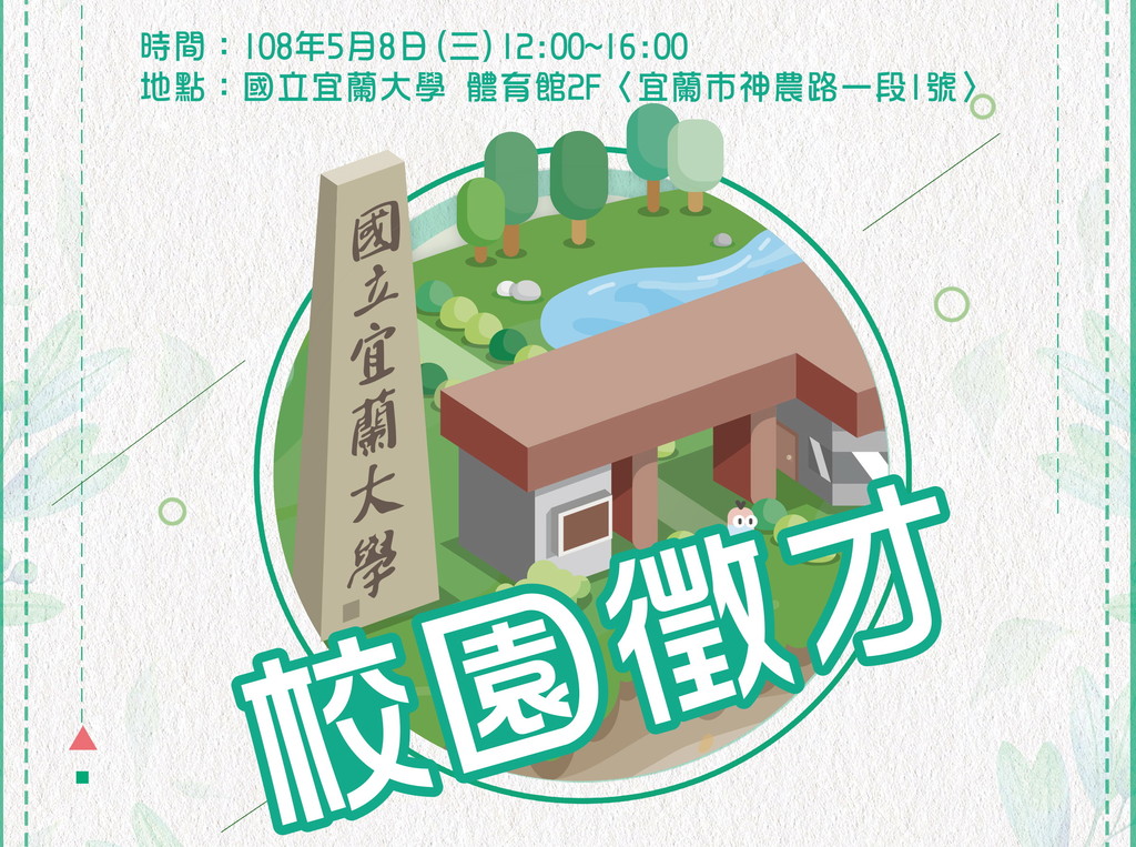 「畢業即就業」!國立宜蘭大學配合校慶及畢業季的到來,為協助應屆畢業生及宜蘭縣民發揮所長順利就業,並提供在校生觀摩了解職場趨勢之機會,校方學生事務處就業服務輔導組,聯合勞動部勞動力發展署北基宜花金馬分署羅東就業中心,於5月8日上午12時至16時,結合校慶舉辦2019國立宜蘭大學「宜鳴驚人 大展宏圖」校園徵才活動。