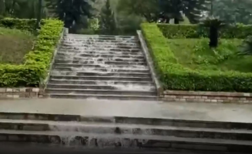 ▼廣東暴雨讓階梯出現瀑布。(圖/翻攝自梨視頻)