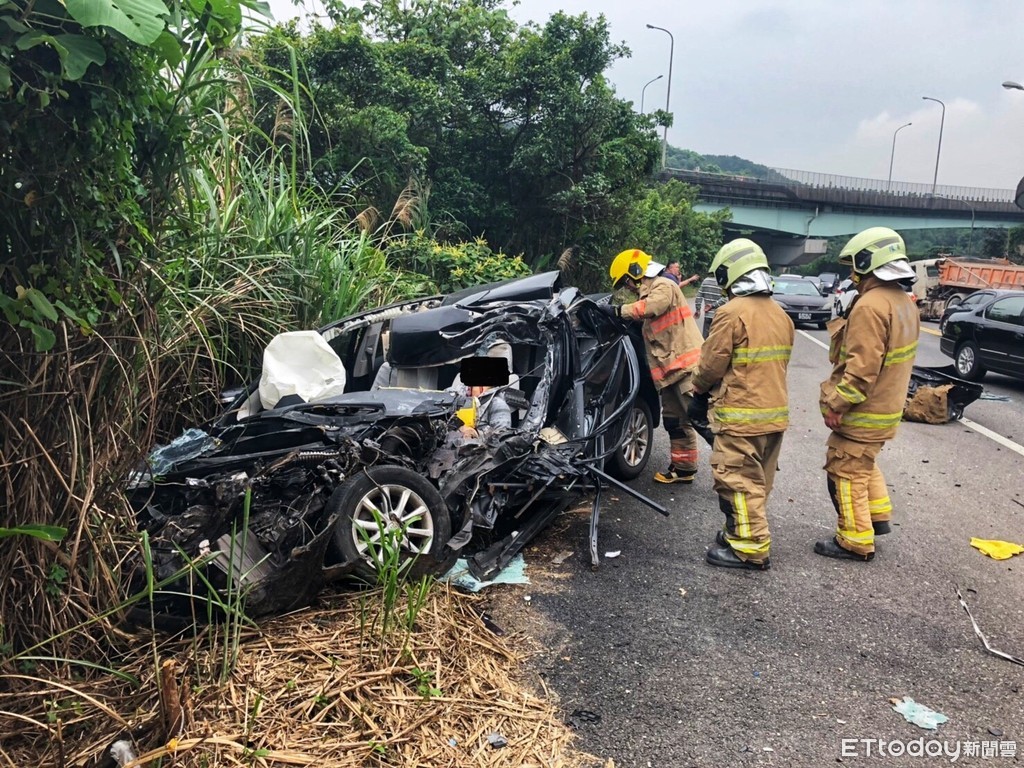 ▲ 中山高暖暖交流道南下匝道車禍,受困男駕駛已無生命跡象。(圖/記者郭世賢翻攝,下同)