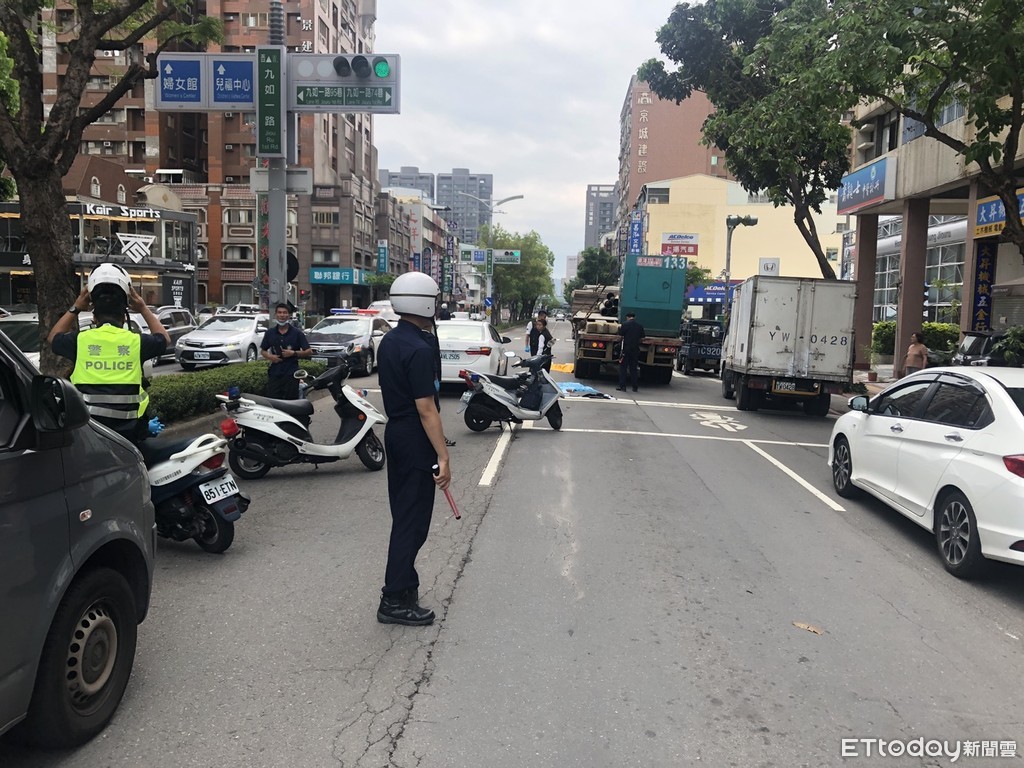 ▲高雄市九如一路發生死亡車禍,機車騎士疑似貪快鑽車陣,不慎擦撞自小客車後倒地,遭旁邊的聯結車輾過,爆頭身亡。(圖/記者賴君欣翻攝)