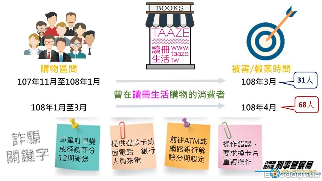 刑事局21日中午對知名購書網站「TAAZE 讀冊生活網路書店」提出預警!「讀冊生活」網購平臺疑消費者個資訂單遭駭外洩,從今年3月起已有31人打165反詐騙專線反映,詐騙集團冒用「讀冊生活」網購平臺,歹徒以「工作人員作業疏失,導致單筆訂單變成分期由銀行帳戶扣款付款,要求訂戶ATM解除設定」,一名女研究生遭詐17萬元。