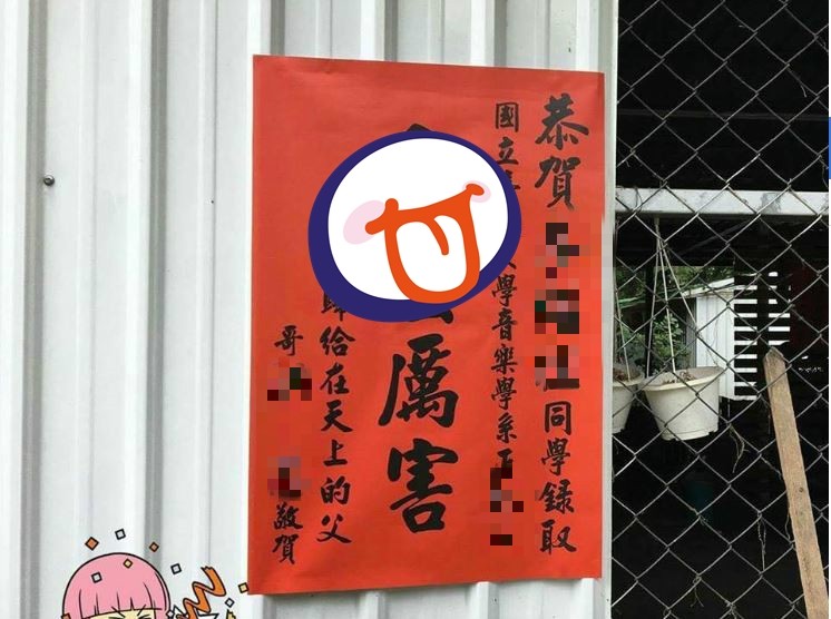 一名女網友日前在一處鐵皮屋,發現這幅祝賀聯,只見上面祝賀某位同學錄取國立台東大學音樂學系,重點是,有別於一般正經八百的賀詞,中間「拿麼厲害」4個大字,不僅自帶音效,還有莫名喜感。