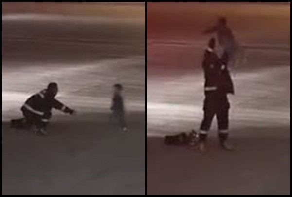 ▼消防員爸爸看見兒子,身上的疲憊感瞬間全消。(圖/翻攝自微博)