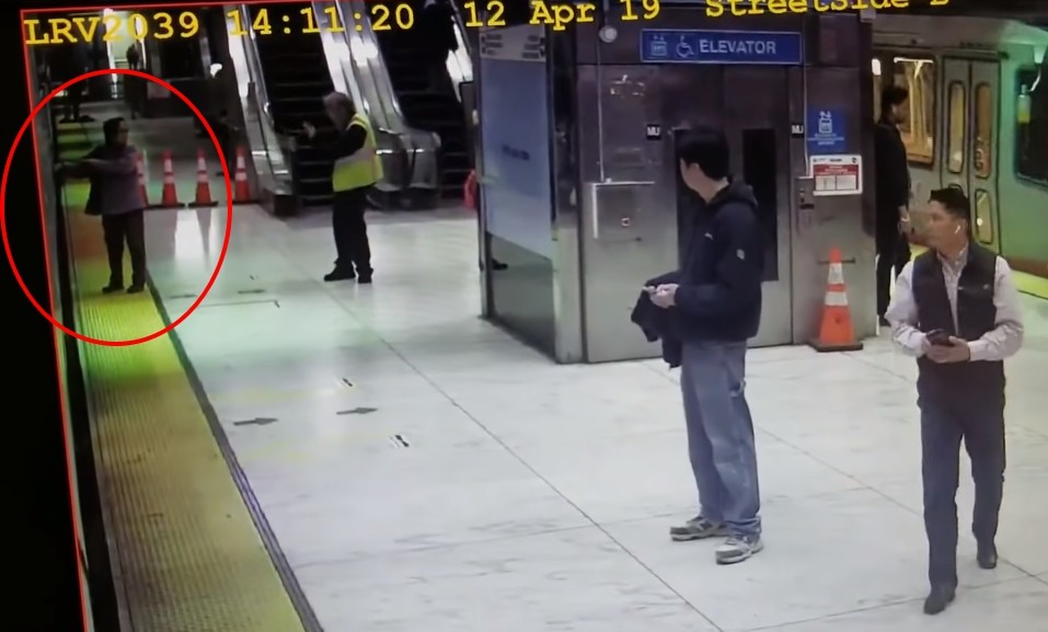 ▲婦人回頭向站務人員求救。(圖/攝自YouTube/San Francisco Examiner,下同)