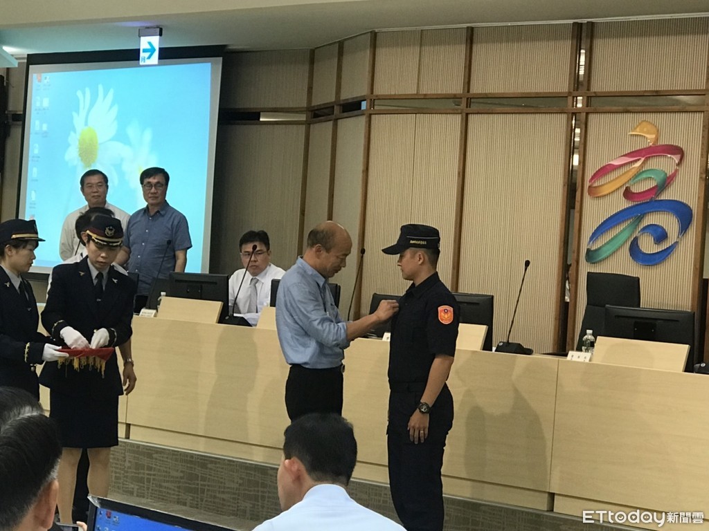 ▲2警英勇擊斃通緝犯獲破格擢升,韓國瑜親自授階。(圖/記者洪靖宜攝)