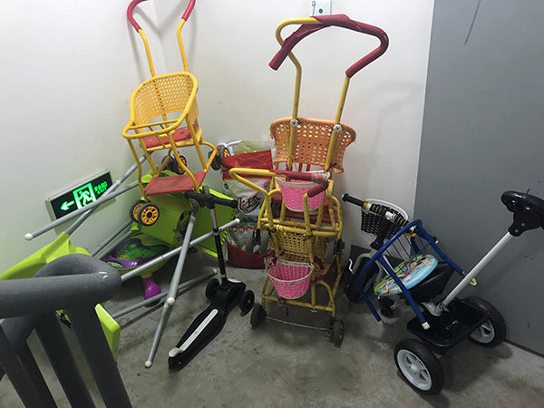 ▲楊女孩子的嬰兒車、滑板車被堆放在樓梯間樓道處。(圖/翻攝自澎湃新聞)