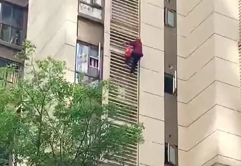 一段影片25日中午流傳到網上,內容驚呆網民。影片顯示,一位滿頭白髮的阿嬤,提著一根紅布袋,抓住空調外機的鐵欄杆,一步一步往下爬,從15樓爬到了5樓。高樓的一個小臺階中斷了她這場「冒險」,她踩在邊緣轉過身,單手抓住欄杆,還淡定望向樓下聚集的市民。