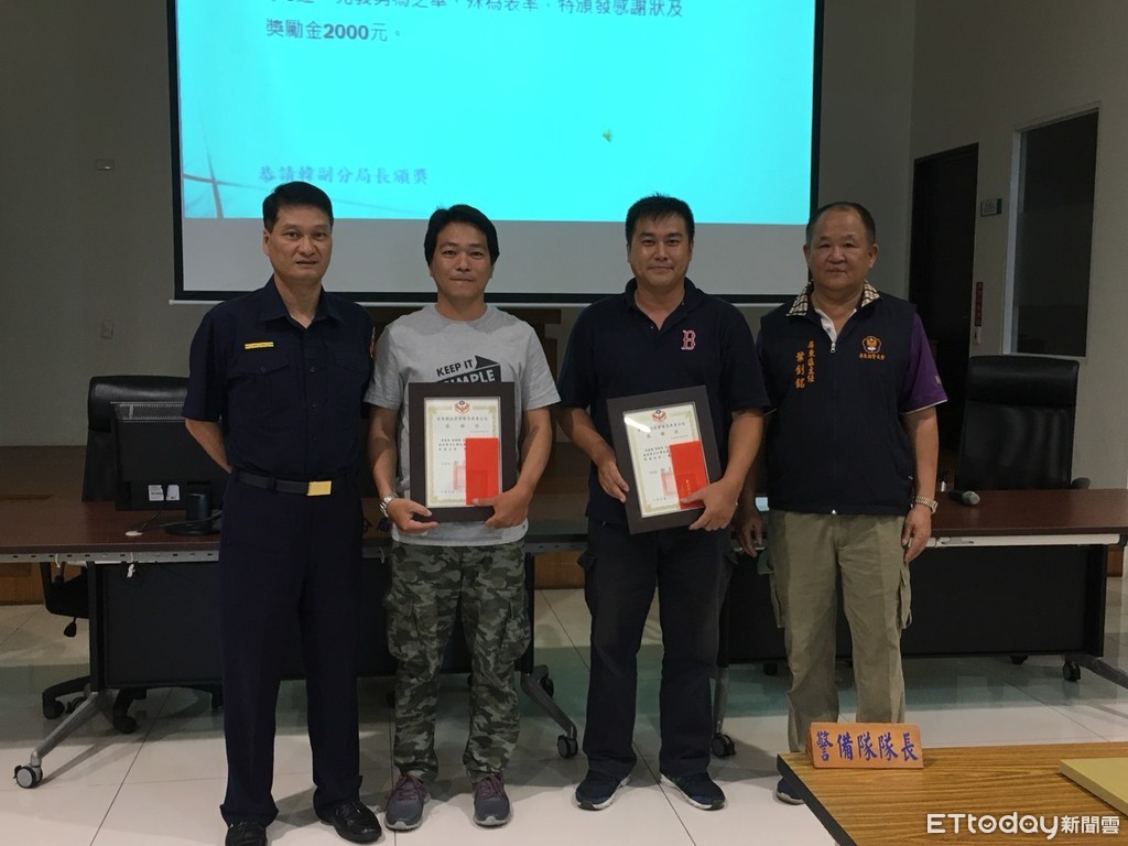 ▲屏東分局副分局長韓光龍(左)頒獎給協助警方抓賊的保全人員。(圖/記者陳崑福翻攝)