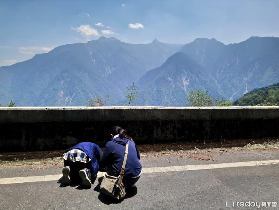 ▲將玉山山脈壯闊景色盡收眼底,尾崎靜代難掩情緒激動,朝向玉山跪拜。(圖/印莉敏提供/下同)