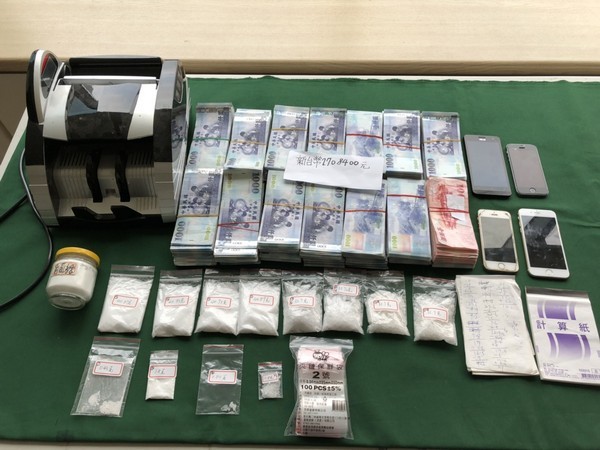 警方當場查獲該顏姓毒販,並起獲一級毒品海洛因2.23公克、二級毒品安非他命307.1公克、三級毒品愷他命1.8公克、販毒帳冊2本,另查獲販毒不法所得270多萬,得動用點鈔機來清點。