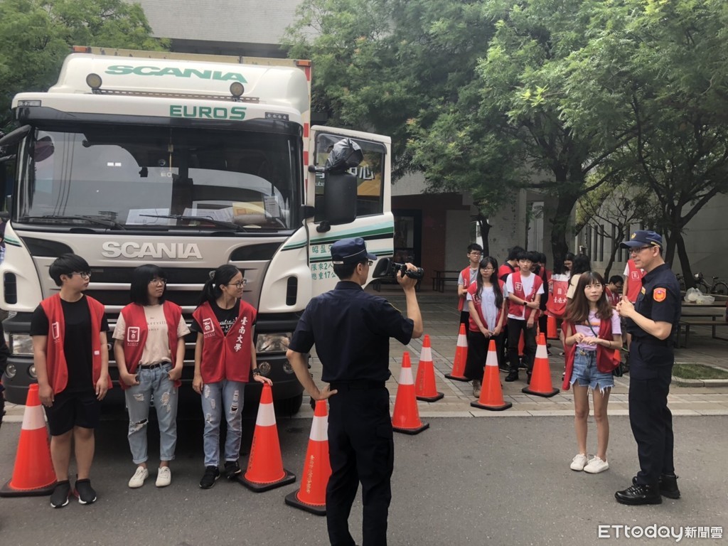 ▲台南市警交通警察大隊商借物流企業車隊,於台南大學舉辦「高高在上的視角」體驗活動。(圖/記者林悅翻攝,下同)