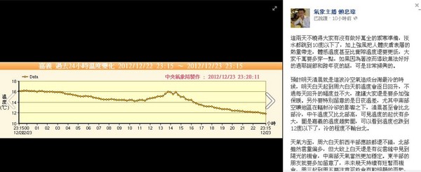 賴忠瑋提醒,特別要注意的是日夜溫差,尤其中南部空曠地區在輻射冷卻的影響之下,清晨甚至會比北部冷,中午溫度又比北部高,可見溫度的起伏有多大,圖是嘉義的溫度趨勢圖,可以看到溫度也跌到12度以下了,冷的程度不輸台北。