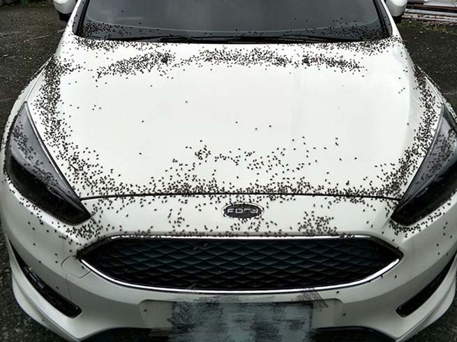 一輛白色福特Focus停在田邊,結果慘遭蒼蠅大軍攻擊,整個白色引擎蓋上都是滿滿的蒼蠅飛舞讓人看了就頭皮發麻。