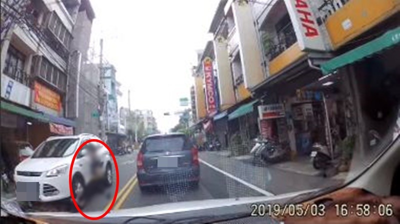 ▲▼男童跑到對向後沒多久,又折返跑回撞上一台白色休旅車。(圖/翻攝自Facebook/爆料公社,下同)