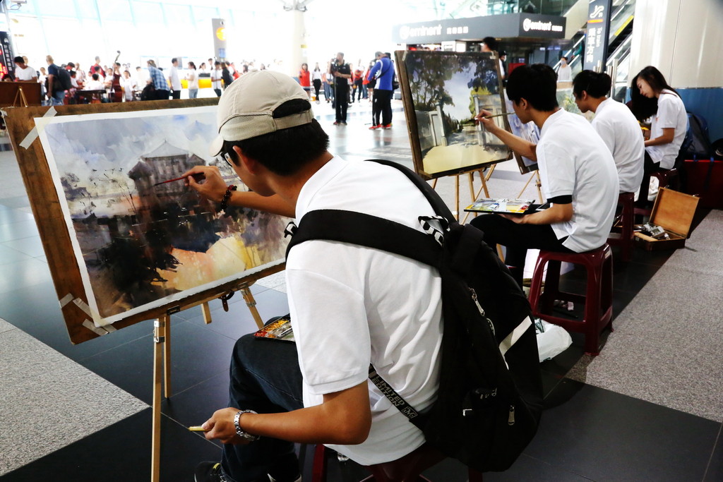 活動先由嘉大視覺藝術學系黃冠文等8位同學於高鐵嘉義站大廳,現場以素描、水彩等創作方式,重現早期嘉義農林學校與嘉義師範學校百年風華,同時,嘉大音樂系謝士雲老師帶領蘭潭提琴社20位同學加入演奏,緊接著蘭潭國樂團、嘉大附小國樂團小朋友也加入演奏,南來北往的旅客,無不藉由這一刻鐘音符的跳動感染嘉大百年校慶的喜悅。