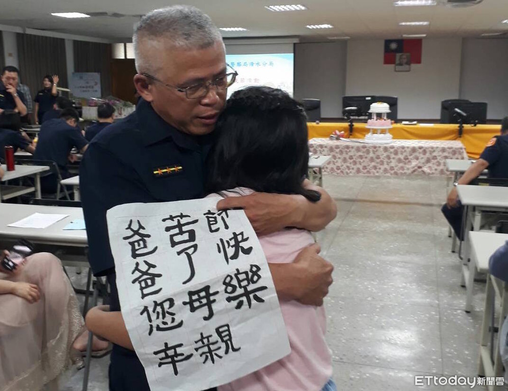 台中清水警分局8日舉辦母親節慶祝活動,除邀請女性同仁參與,更首度邀請「爸爸警察」共度,其中一名父兼母職的光華所員警丁威誠與女兒擁抱,感動告白讓眾人紅了眼眶。女兒忍不住情緒在鏡頭前落淚,「爸辛苦了,母親節快樂。」