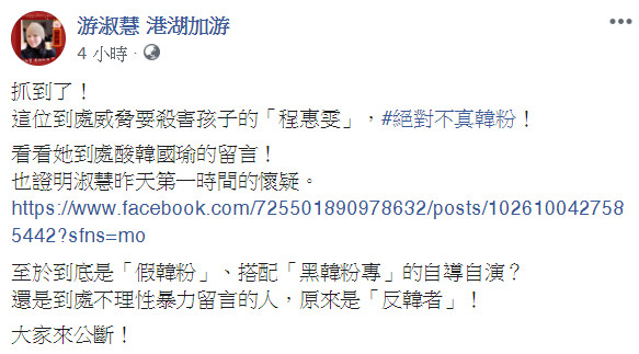 在藍委江啟臣直言「妳(程姓女網友)就是人身威脅的反串網軍」後,游淑慧在10日早上再次貼文稱,要還真正的韓粉們一個公道,「淑慧是警政衛生部門的成員,今天也會把這樣公然威脅的犯罪行為,要求刑警大隊偵辦!」