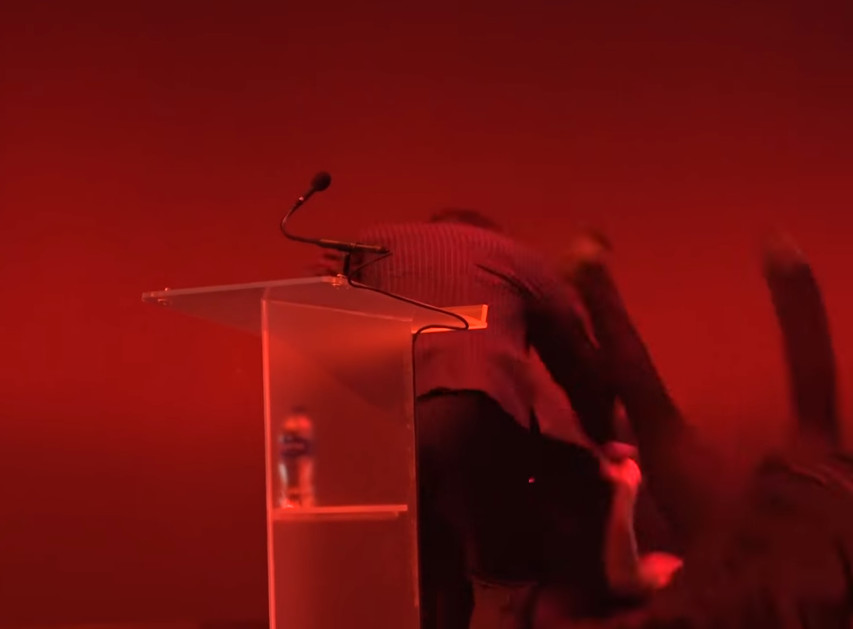 ▼ 黑衣工作人員直接上台打斷雅各斯的演講。(圖/翻攝臉書/WVLT,下同。)