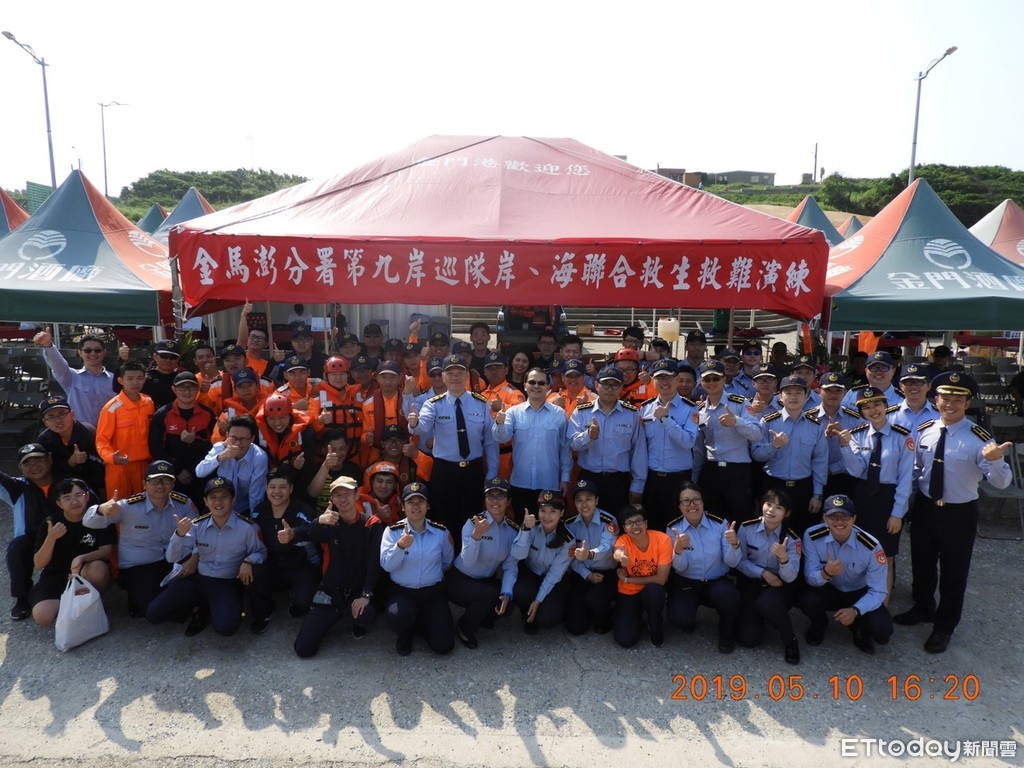 第九岸巡隊特別針對轄區特性,會同友軍單位共同辦理「岸、海聯合救生救難演練」,特別加入「吊掛救援演練」課目,演練計動員空中勤務總隊海豚直升機1架、艦隊分署第九海巡隊100噸巡防艇1艘、兩棲偵察營成功艇2艘、金門縣消防局IRB救生艇1艘,第九岸巡隊多功能巡緝艇2艘與參演人員計47人。
