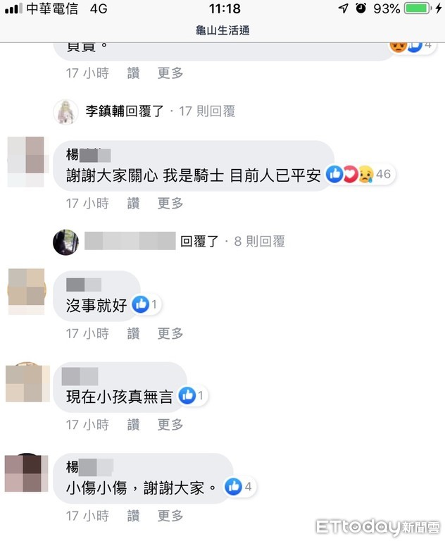 ▲桃園市「龜山生活通臉書粉絲團」上,摔車楊姓騎士說他人平安。(圖/翻攝自龜山生活通臉書粉絲團)
