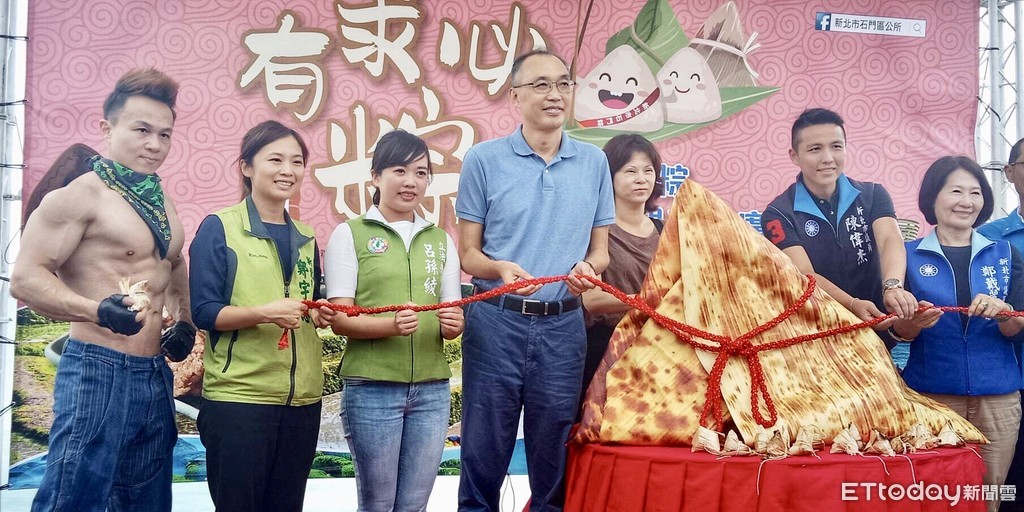 新北市民政局與石門區公所11日下午,在富基漁港舉辦「石門粽、農特產等觀光推廣活動」,由新北市副市長謝政達與石門區長林俊宏合力剝開一顆重達百斤,同時也分送給現場民眾,並邀請30位年長的媽媽,一起來呷肉粽「粽頭彩咬金戒」,其中一顆粽子內藏價值近5000元的金戒子。