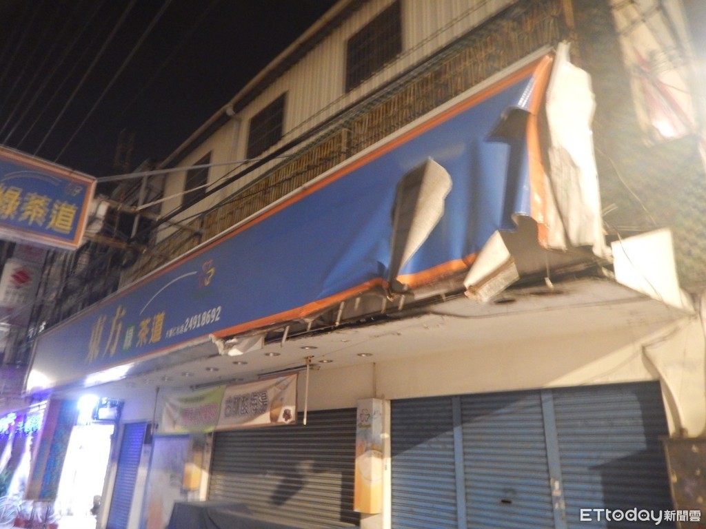 ▲巫姓貨櫃車司機未注意後方貨櫃高度,連續擦撞沿途7店家招牌、遮雨棚。(圖/記者陳玉翻攝,下同)
