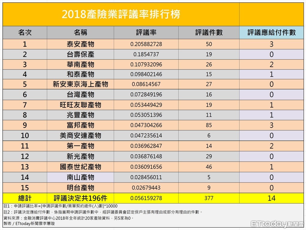 15家產險中,去年一整年完成評議案件中,台壽保產、新安東京海上產險、台灣產物、美商安達產物、新光產物、南山產物與明台產物的保戶申請評議案件,皆全部敗訴。也就是說業者全勝。