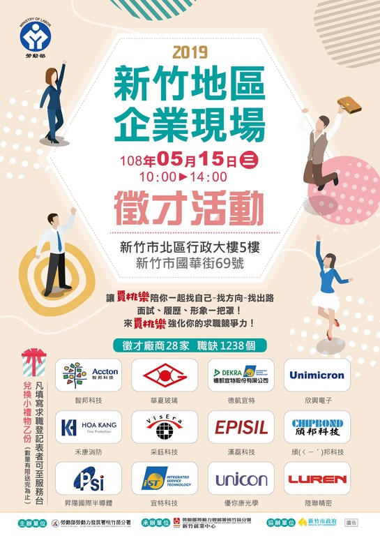 2019年新竹地區企業現場徵才活動將於5月15日上午10時至下午2時,在新竹市北區行政大樓5樓大禮堂(新竹市國華街69號)熱鬧登場,勞工處提醒,各項就業服務最新活動訊息,可上勞動部勞動力發展署桃竹苗分署徵才活動E網(https://www.jobs.org.tw/)、台灣就業通(www.taiwanjobs.gov.tw)。如欲進一步瞭解各項就業服務內容,請撥打市府1999服務專線或洽勞工處就業服務科03-5324900分機37。