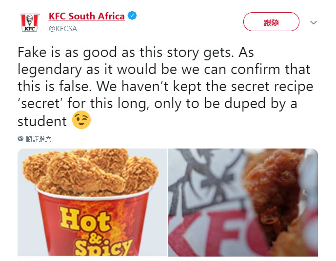 ▲ 肯德基南非總公司在推特強調,「大學生裝稽查員白吃一年餐點」是假消息。(圖/翻攝自KFC South Africa推特)