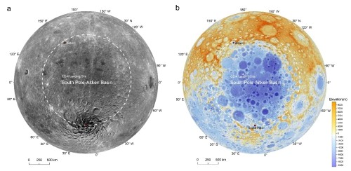 ▲月球南極-艾特肯盆地和嫦娥4號著陸點位置圖。左圖為影像圖,右圖為地形圖。(圖/翻攝自中國科學院國家天文台)